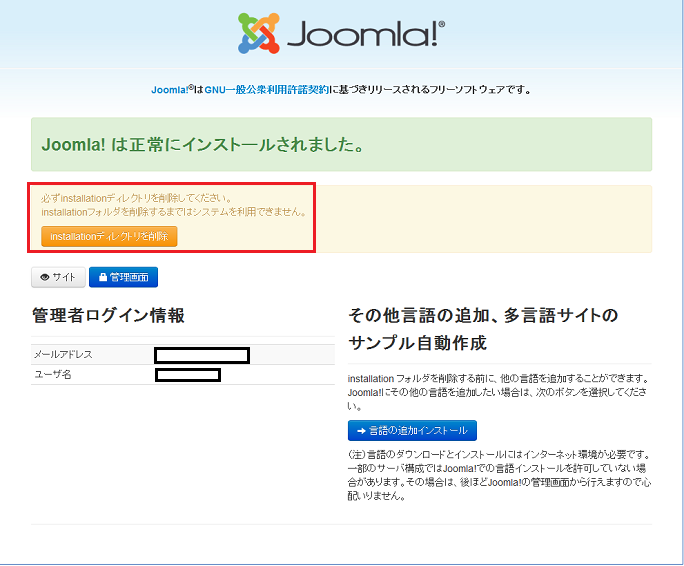 インストール終了後、installationディレクトリは削除。