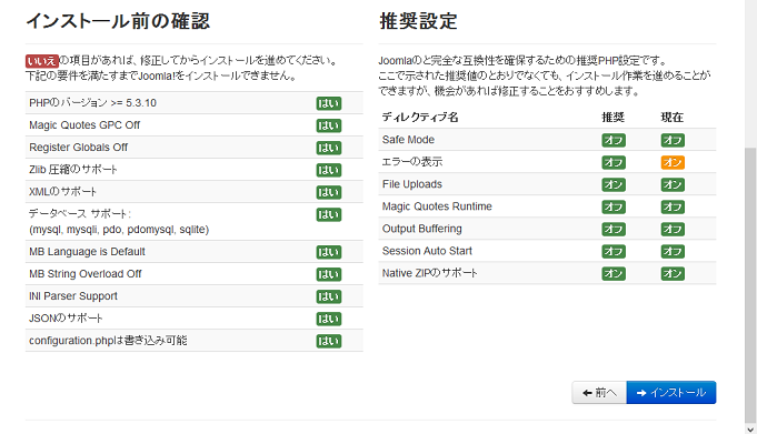 下記の要件を満たすまでJoomla!をインストールできません。