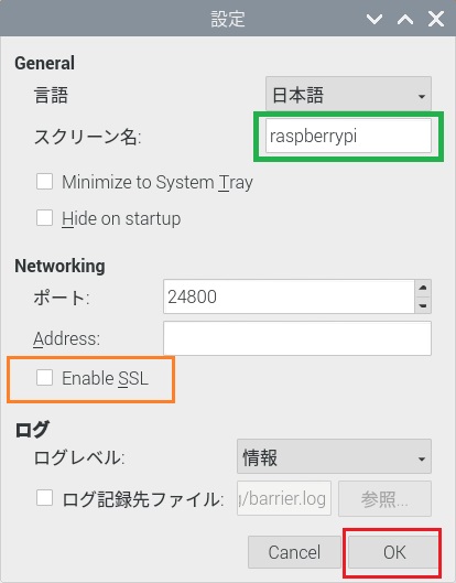 サーバーIPの情報などはBarrier.confのデータから再読み込みされます。Barrierを再起動した時に何も表示されていない場合は、Barrier.confが保存されていない可能性があります。