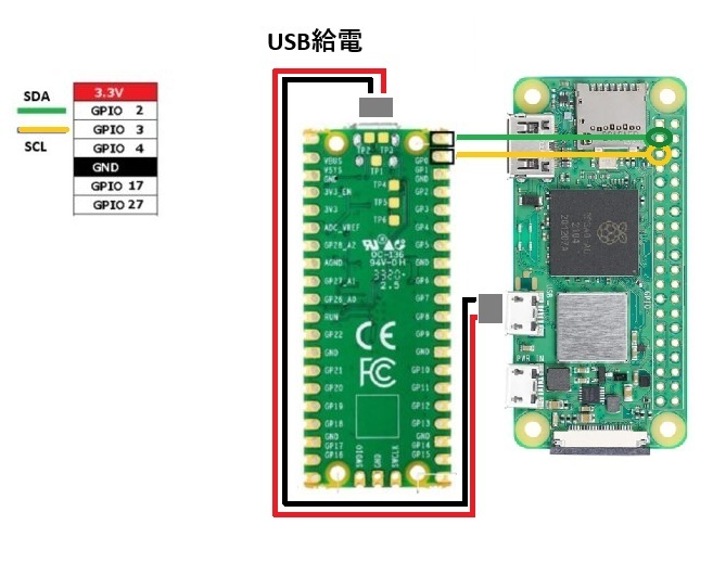 ここではPicoへの電力供給にGPIOを使っていますが、Zeroや3以前のラズパイならMicroUSBのオスーオスで供給することも可です。