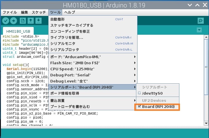 ファイルー>スケッチ例ー>Cameraー>exampleー>HM01B0_USB