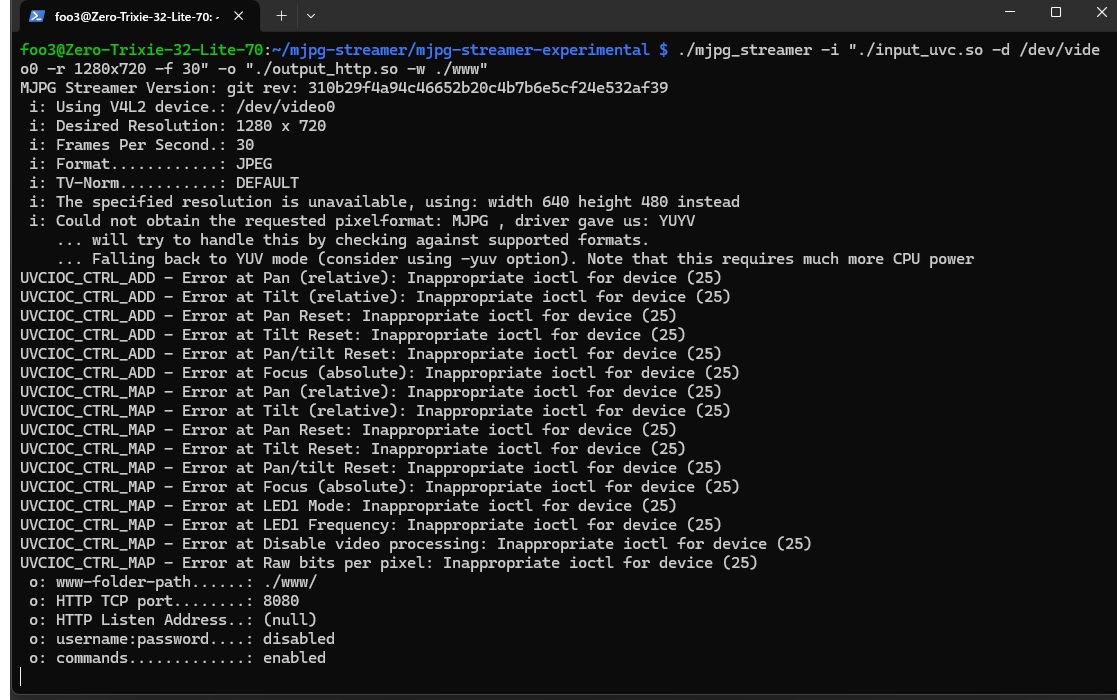 cd ~/mjpg-streamer/mjpg-streamer-experimental ./mjpg_streamer -i "./input_uvc.so -d /dev/video0 -r 640x480 -f 30" -o "./output_http.so -w ./www" |